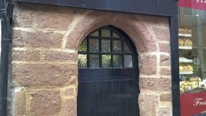Two doors down, at No.19 Waterbeer Street, there is another fragment of Heavitree Stone: masonry blocks and an arched doorway. There is some simple carving of the stones in the arch, which has weathered.